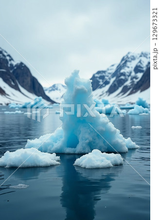 Breathtaking icy structures emerge from serene waters, reflecting the rugged mountain backdrop as clouds blanket the twilight sky, capturing nature's raw beauty in the Arctic Generative AI