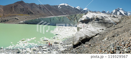 Panorama of the foothills of Mount Kyzylasker, a glacier with a moraine blue lake in the highlands. Ancient arctic large glacier in sunny weather