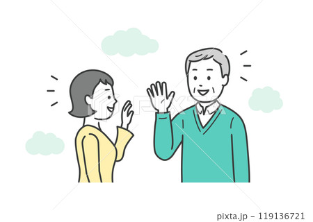 屋外で高齢男性と若い女性が会って挨拶をかわすイラスト