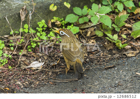 地面の餌を探すガビチョウ