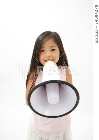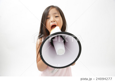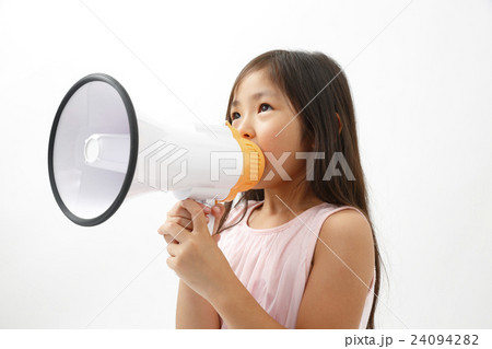 拡声器で応援をする少女 白バック