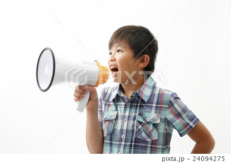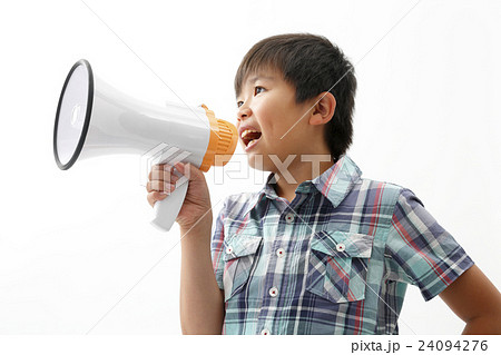 拡声器で応援をする少年 白バック
