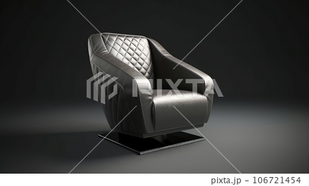 A modern chair made of black leather on a metal platform is highlighted on a black background