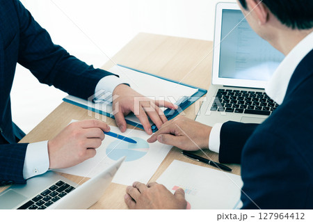 ノートパソコンを見ながら会話する若いビジネスマン2人 商談 営業 勧誘