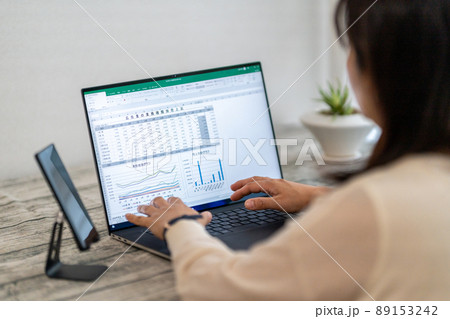 パソコン画面のグラフを見ながら考える女性