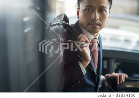 A businessman is carrying his bag over his shoulder and looking at the car.