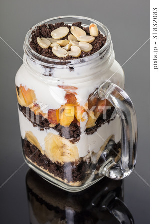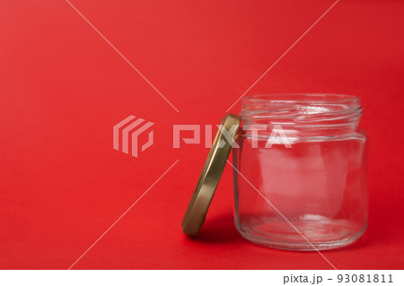 Realistic transparent glass jar with jam, confiture or sauce. Preserving packaging set. Label and