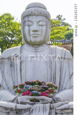 壷阪寺 地蔵堂から見る大釈迦如来石像と紫陽花