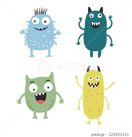 Cartoon cute monsters. Flat monster with crazy smile, silly color isolated kids characters. Funny toys, baby creatures design, decent vector kit