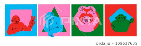 Abstract characters. Modern figures. Graphic icons. Cartoon geometric human and creature. Happy strange doodles. Person looking through window. Smiling funny faces. Bright colors. Vector banners set