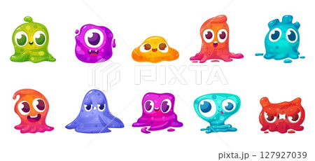 Slimy aliens. Funny jelly style monsters with big eyes. Cute ufo characters, slime colorful creatures. Children mascots, nowaday vector game set