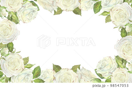 Rectangular frame with white roses and leaves. Watercolor illustration. Place for text. Isolated on a white background.For design of greeting card, wedding invitation, stickers