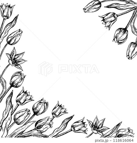 A frame made of tulips. A black and white vector graphic illustration made by hand. A postcard template on a white background. For packages, labels and flyers, posters and banners.