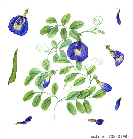 Climbing blue clitoria ternatea in full bloom. Green leaves, flowers, buds. Dried flower, pod, leaf. Bending branches of Asian plant. Butterfly pea flower, anchan. Watercolor illustration