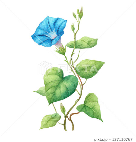 Blue morning glory flower with green heart shaped leaves and slender vine stem, natural botanical illustration with fresh colors