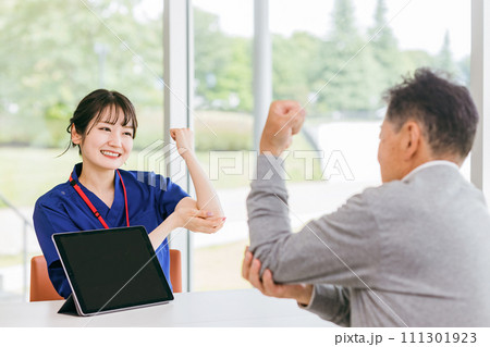 病院・介護施設で腕・肘のリハビリする車椅子に乗る高齢者と介護士(理学療法士・看護師)