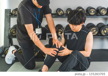 膝関節を痛がるトレーニングをする男性とスポーツ理学療法士の男性スタッフ