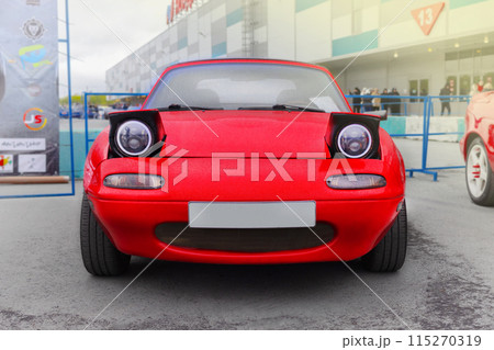 Russia, Novosibirsk, 25.05.2024 Midday, Red Mazda Miata MX-5 Roadster 1989, front view pop-up headlights close up