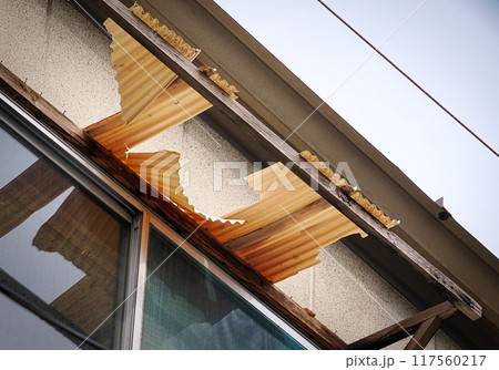 劣化してぼろぼろに壊れたポリカ波板(プラスチックトタン)