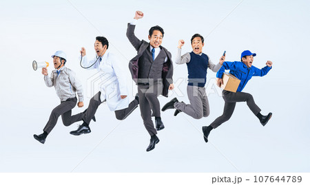 ジャンプする様々な職業に扮装した同一人物のミドル男性(切り抜きPNGも販売中!作者プロフィール参照)