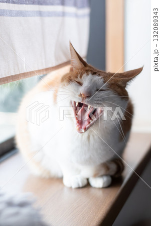 寝起きで伸びをする可愛い猫 シャムトラ猫