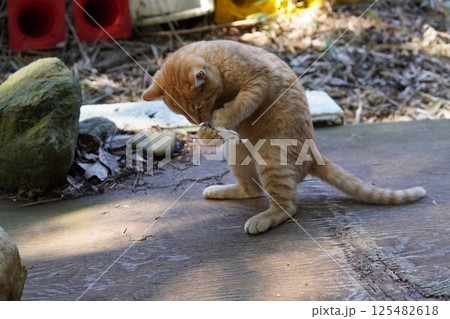 公園の芝生で猫じゃらしで遊ぶ猫
