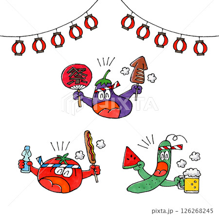 夏祭りと夏野菜のキャラクター(ナス、トマト、きゅうり)