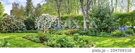 Landscape view of landscaped garden in serene, peaceful private or secluded backyard at home. Neat, calm and freshly mowed green lawn and grass. Serene, tranquil scenic nature yard to relax on break