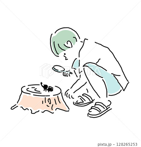 虫眼鏡でカブトムシを観察する男の子の夏イラスト(小学生・自由研究)
