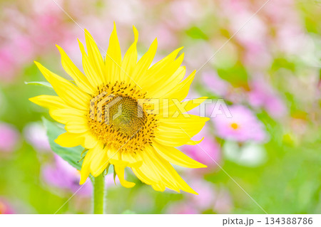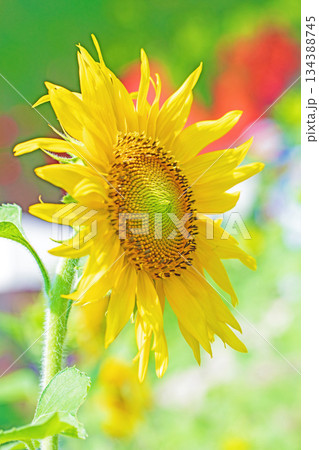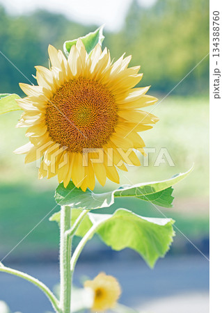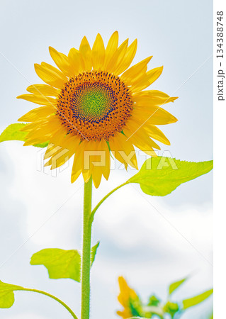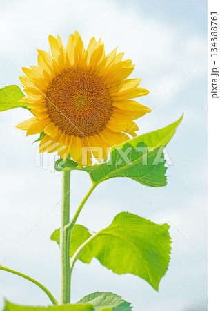 家の周りの草花 四季の色々 農園の花畑に美しい大輪のひまわりの花が青空に向かって咲いています