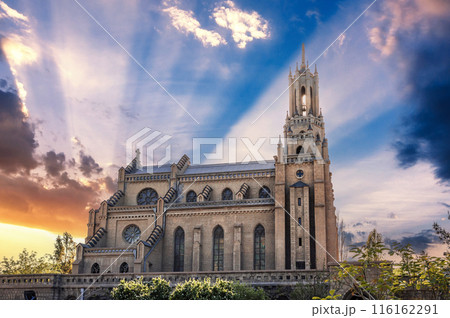 Cathedral of the Sacred Heart of Jesus in Tashkent in Uzbekistan. Exterior of ancient old gothic Church on background of beautiful sky at sunrise in spring