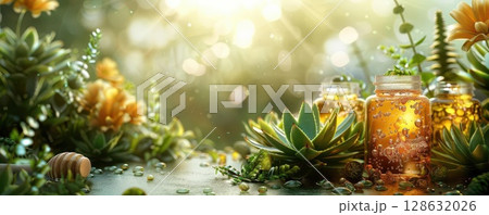 Golden light filters through lush foliage, illuminating a collection of glass bottles and succulent plants.