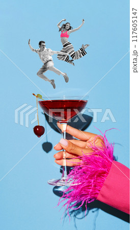 Poster. Contemporary art collage. Stylish dancers jumping to Drunk Cherry cocktail held by hand in festive dress against blue background.