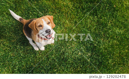 Cheerful beagle dog sitting on a bright green lawn and looking up with a happy expression and alert posture