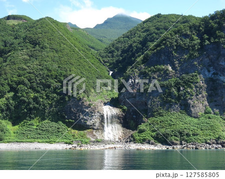 知床観光船おーろらから見たカムイワッカの滝と知床硫黄山