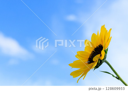 青空に映える一輪のひまわりの夏らしい写真