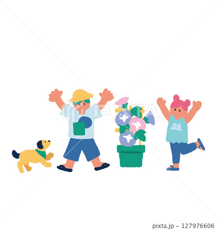 夏休みの子供 手書きのフラットでカラフルなイラスト