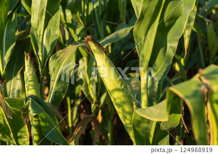 Golden corn on the cob stands proudly in a lush green field, basking in warm sunlight during late summer, ready for harvest