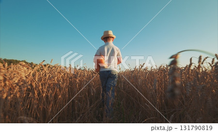 A young child happily walking through a beautiful wheat field on a bright sunny day