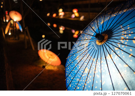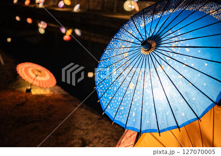 岡山県倉敷市の観光地の美観地区で夜のライトアップされた和傘 倉敷春宵あかり