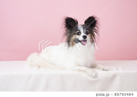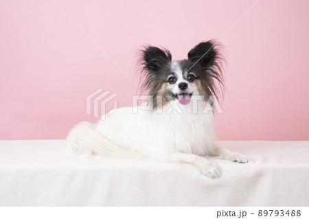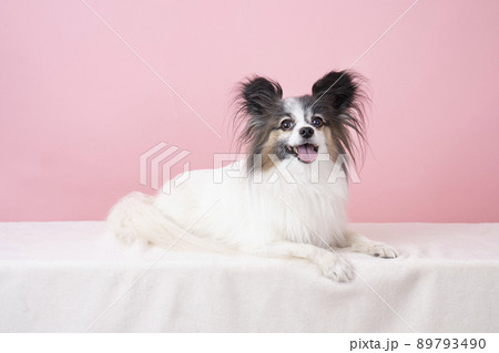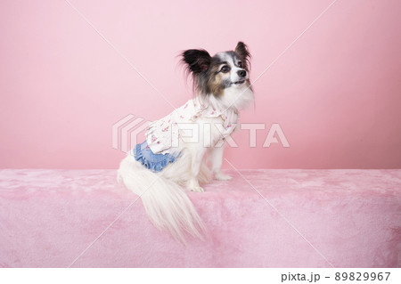 ピンクバックで羽織袴を着たパピヨンの夏彦