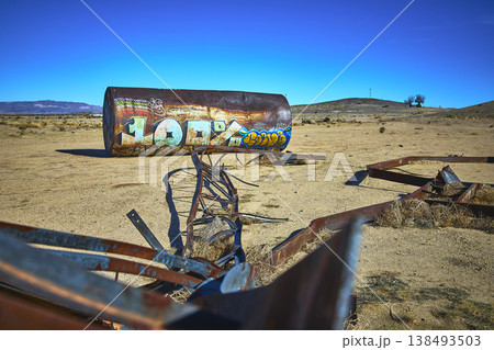 Abandoned Graffiti Covered Tank and Desert Wreckage California Water Park Ruins