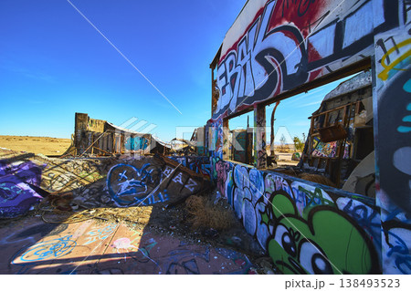 Graffiti Wall and Abandoned Water Park Ruins in California Desert Under Blue Sky