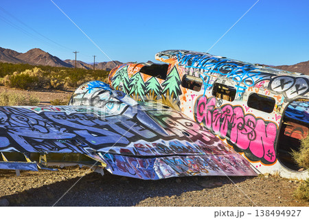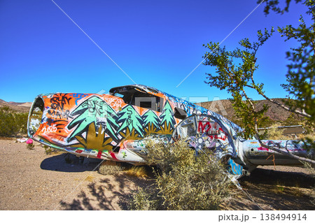 Graffiti Airplane Wreck in Nevada Desert Under Blue Sky Near Beatty