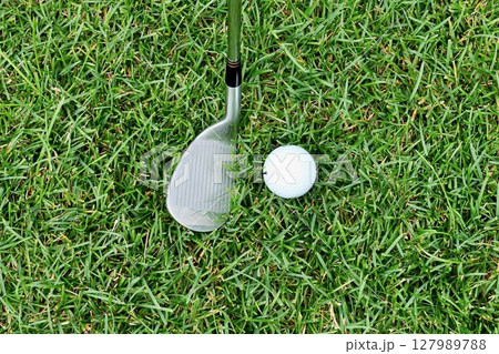 芝生「ラフ」上の白いゴルフボールとサンドウェッジ