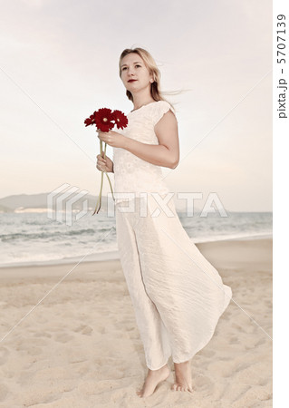 Beautiful blonde woman on the beach. Lady in white