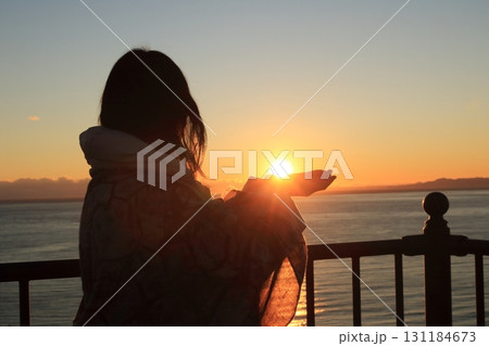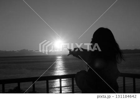 駿河湾の海の夕陽と一人旅女性のシルエット