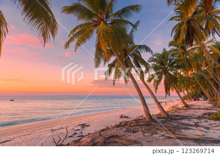 Sunset on paradise tropical beach with palm trees and quiet sea. Natural pastel tones