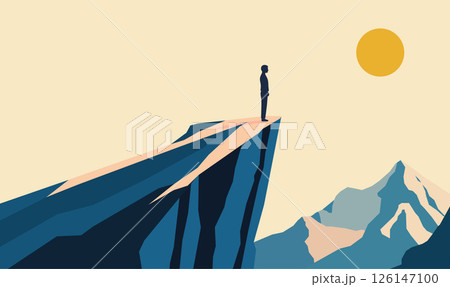 Man Silhouette Standing on Rocky Cliff Top Landscape as Success Symbol with Sun in the Morning