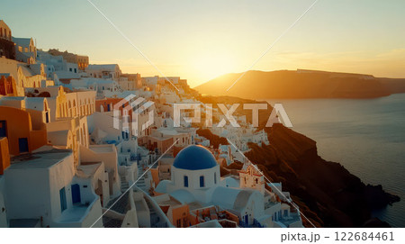 Santorini Sunset Breathtaking View of Iconic Blue Domes and Aegean Sea.